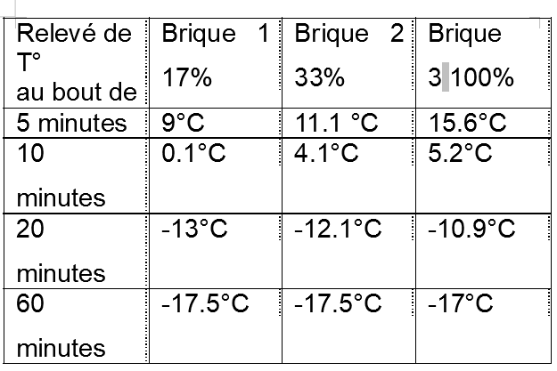 Pour notre test nous avons placé les 3 briques (dont le pourcentage représente le taux de remplissage en plastique) dans un congélateur à -20°C.