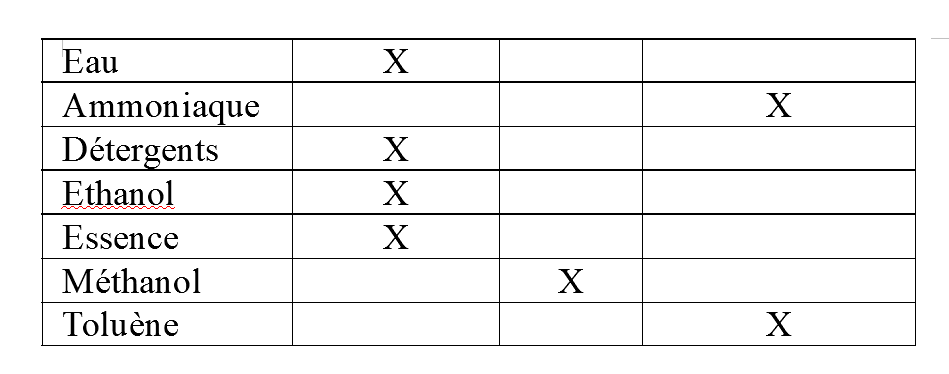 Ce test consiste plus exactement à tester la solubilité de notre matériau avec le propanone (acétone ayant pour caractéristique d'être un dissolvant) et le cyclohexane (utilisé pour des applications industrielles).