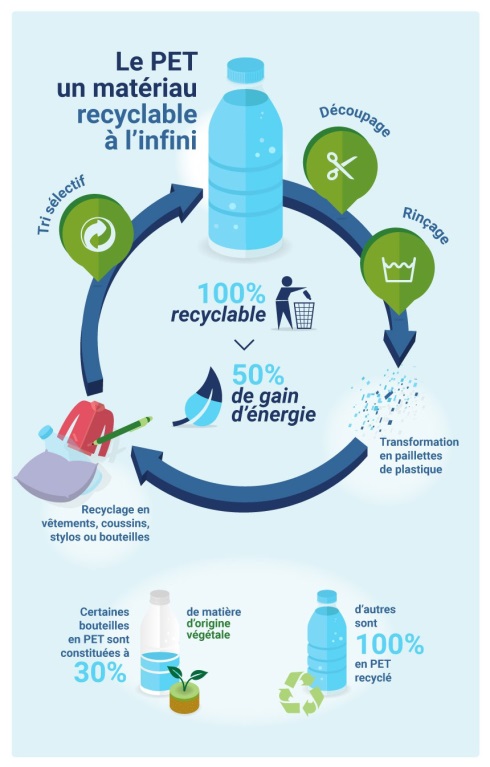 Pour la production de bouteilles, l'industrie utilise le PET-A. Il est très flexible (non cristallin) et, par conséquent ne se casse pas.
